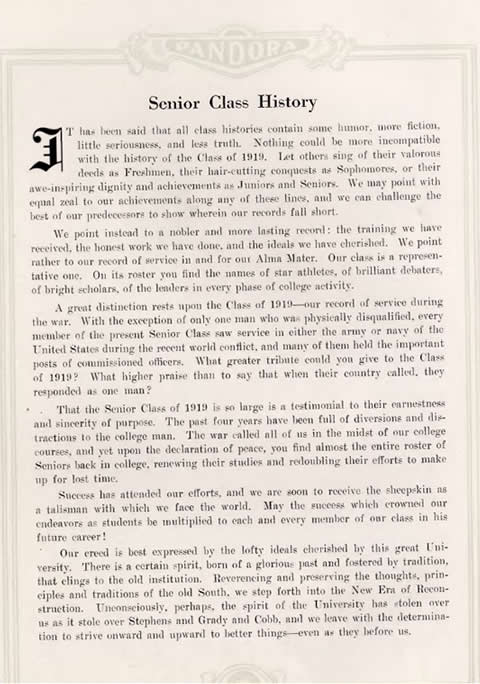 All but one member of the graduating class of 1919 served in the U.S. Navy or Army during WWI and had returned to their studies when peace was declared (UGA; Pandora Yearbook).